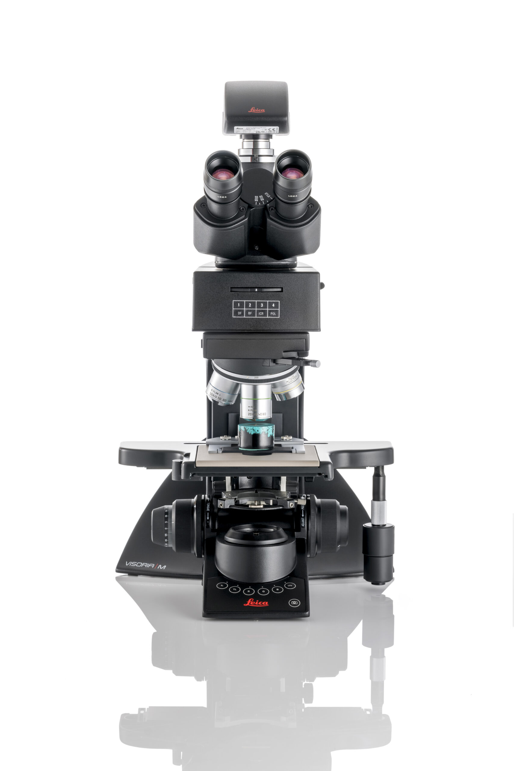 - Incident light axis: Manual encoded, 4-fold filter turret, color-coded diaphragm assistant; aperture diaphragm, slots for analyzer / polarizer, two filter positions