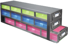 Upright Freezer Racks with 100-Cell Hinged Plastic Storage Boxes – 4 Boxes Deep x 3 Boxes High – Orange Boxes